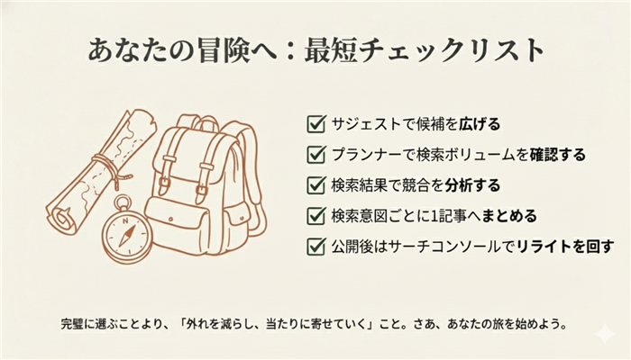 最後に、ブログのキーワード選定を実際に回すための、最短チェックリストを置いておきます。私が大事にしているのは、完璧に選ぶことじゃなくて、「外れを減らして、当たりに寄せていく」ことです。