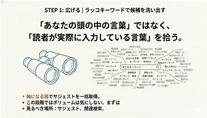 いきなり検索ボリュームや難易度を気にしすぎると手が止まりやすいので、まずは候補を広げて地図を作るイメージが良いと思います。