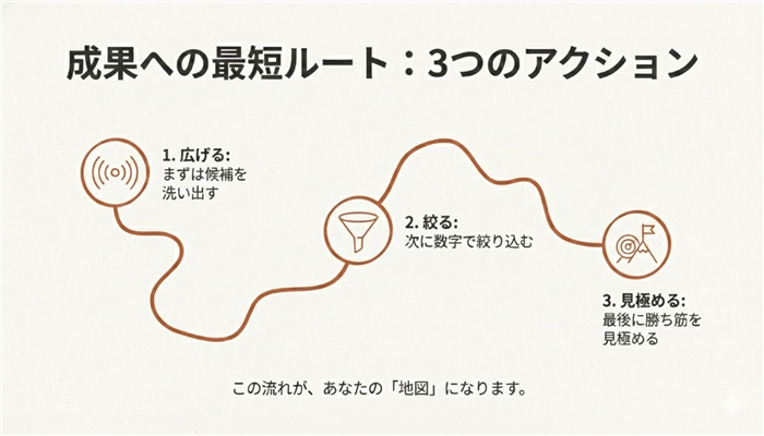 ここでは、ブログのキーワード選定を最短で前に進めるために、手順を順番どおりに整理します。まずは候補を広げて、次に数字で絞り、最後に勝ち筋があるものだけ残す流れです。やること自体は難しくないけど、判断ポイントを間違えると遠回りになります。なので私は、迷いやすいところほど、チェック基準を先に固定して進めています。