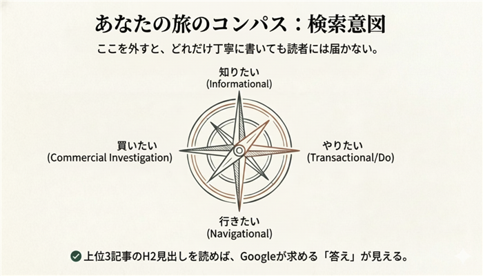 なぜかというと、同じテーマでも検索する人の温度感が違うからです。知りたいだけの人もいれば、今すぐ行動したい人もいるし、買う直前で比較している人もいます。この温度感を混ぜると、記事がふわっとして、読者も検索エンジンも迷います。