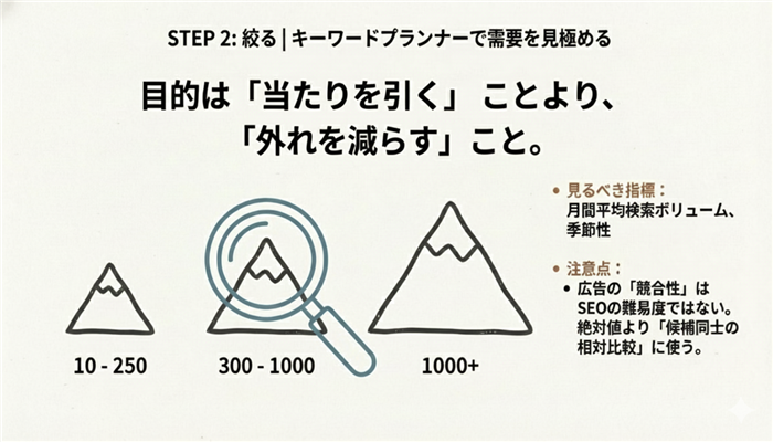 - 検索ボリュームと競合分析の見極め