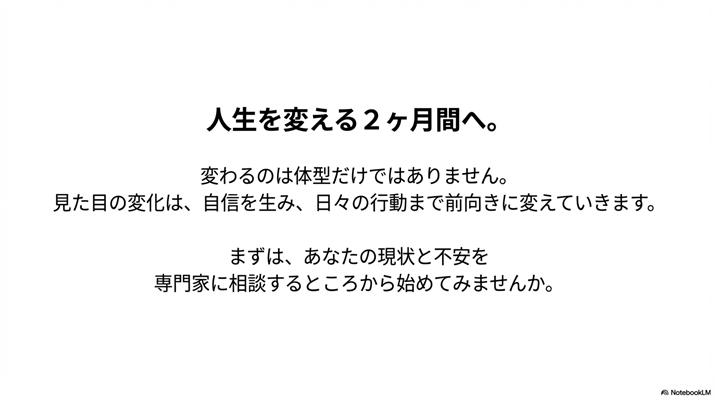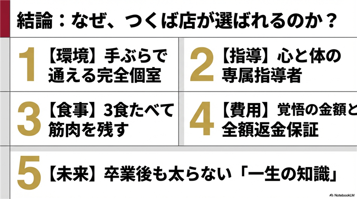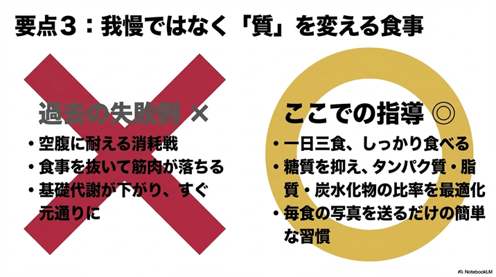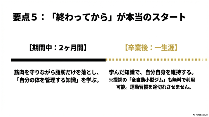 ただし、これはデメリットではなく、プログラム期間中に食事・運動・習慣に関する「一生モノの知識」を身につけ、卒業後は自分でメンテナンスできる状態を目指す、という考え方に基づいています。