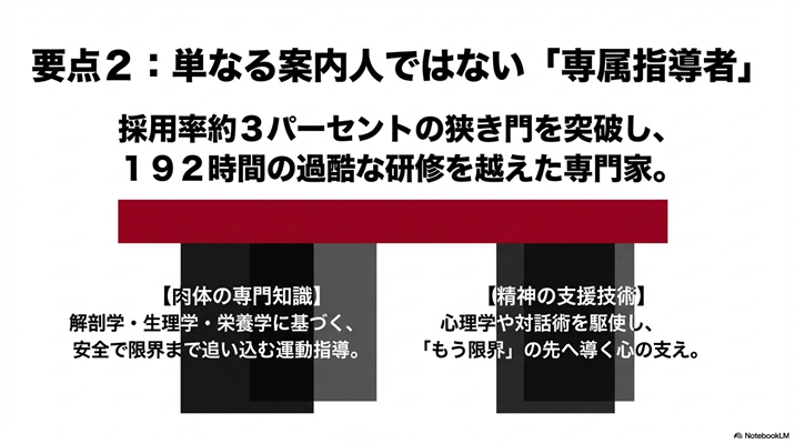 この研修では解剖学・生理学・栄養学といった専門知識はもちろん、コミュニケーション能力やメンタルサポートのスキル、さらには心理学の知識まで身につけることが求められます。「ジムトレーナー」というより「ボディメイクコーチ+メンタルサポーター」という方が近いイメージかもしれません。