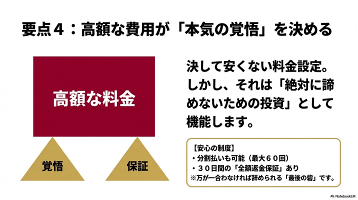 契約内容・返金条件・キャンセルポリシーなどの詳細は、無料カウンセリングや公式サイトで必ず事前に確認しておくことが大切です。高額な投資になるだけに、納得した上で判断してください。
