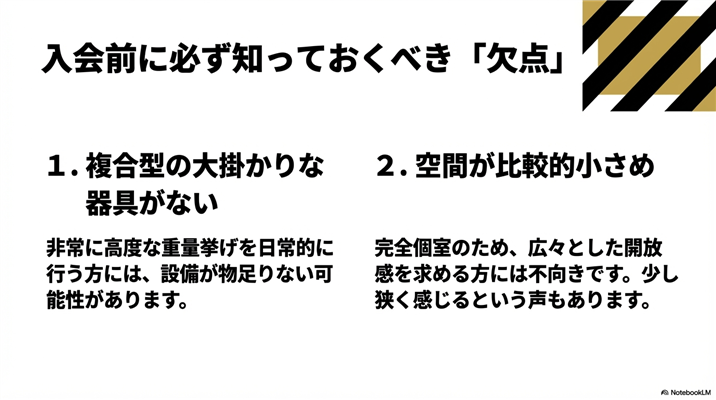 トレーニング設備の面では、「完全個室にパワーラックとダンベルが主な器具なので、すでにある程度トレーニング経験がある上級者には物足りないかもしれない」という意見もあります。