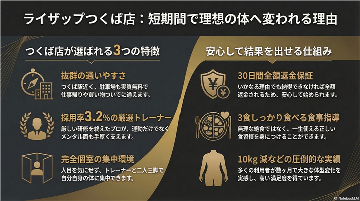 RIZAPつくば店には、数あるパーソナルジムの中から選ばれ続ける理由が3つあります。「高い料金を払っても後悔しない」と感じるだけの根拠が、この店舗にはそろっているからです。