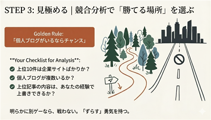 個人ブログがいるなら、同じ土俵でも勝てる余地が残っている可能性が高いです。