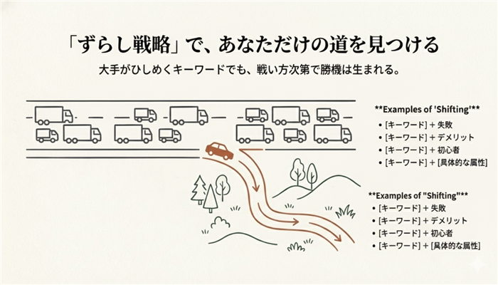 ここ、かなり気になりますよね。私もオンラインショップ運営の現場で、記事を増やしても伸びない時期を経験しました。そのとき効いたのが、ロングテールを軸にして、検索意図を外さず、入れ方までセットで整えるやり方です。