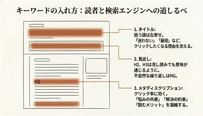 キーワードを不自然に繰り返すより、関連語を自然に散らすほうが読みやすいです。
