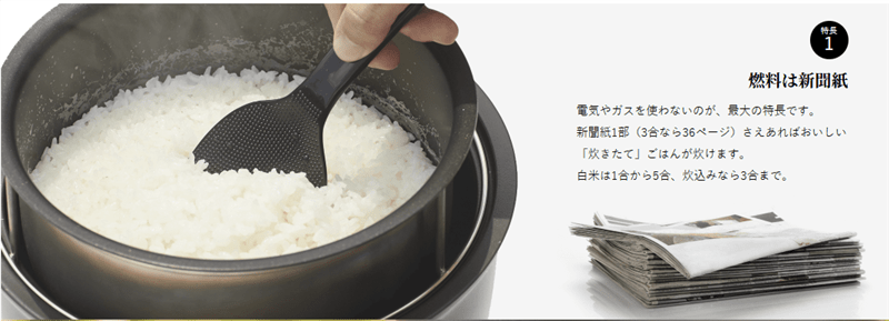 - 電気・ガス不要で新聞紙を燃料とする革新的な炊飯システムを採用