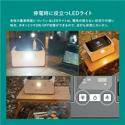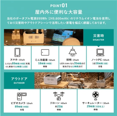 - 災害時やアウトドアでの電源確保の方法と製品性能について詳しく知ることができる