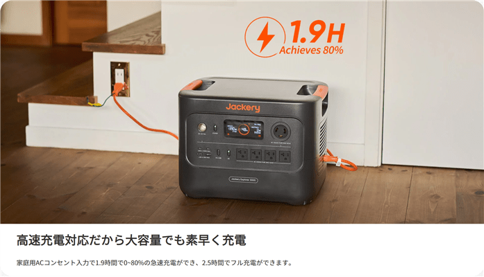 出力性能も見逃せません。定格3,000W・瞬間最大6,000Wの純正弦波ACを4口備え、IH調理器やエアコンなど高負荷家電を同時に稼働できます。さらにAC急速充電なら0-80%を約1.9時間、フル充電でも2.5時間とスピーディーで、1000Wソーラー入力に対応しており晴天下なら約2 - 3時間で満充電が可能です。