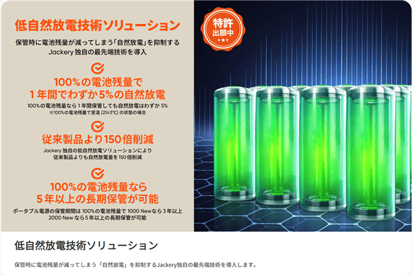 - 自己放電5%/年と4,000サイクル寿命で防災備蓄に有利
