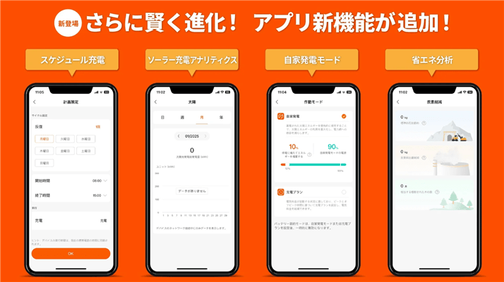 非常時の安心材料として、家庭用UPS相当の無停電電源機能を内蔵し、停電からわずか0.02秒でバックアップ電源に切り替わります。スマホアプリから遠隔監視やバッテリー節約モードの設定も行え、85%で充電を止めて寿命を1.5倍ほど延ばす運用も簡単です。