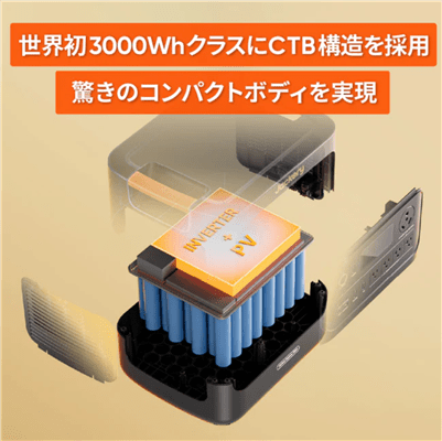 特に大容量モデルでは、CTB(Cell-to-Body)という革新的な構造技術が採用されています。これはバッテリーセルを筐体構造に直接統合する方法で、例えば3000Newでは同等容量の従来製品と比較してサイズを約47%、重量を約43%削減することに成功しました。