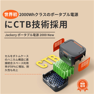 Jackery ポータブル電源 2000 Newは、革新的なCTB(Cell to Body)構造の採用により、2000Whクラスのポータブル電源として業界最軽量となる17.9kgを実現しました。