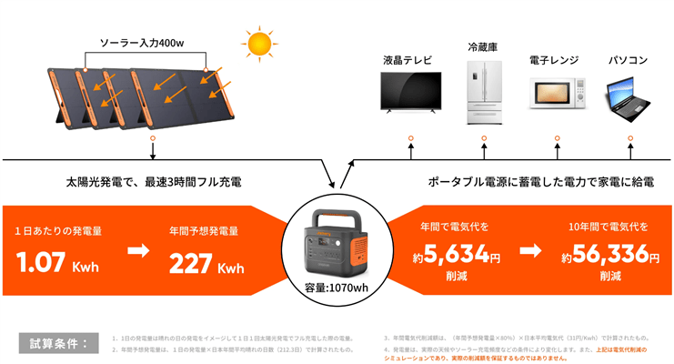 - 基本性能: 容量1070Wh、定格出力1500Wを備え、電子レンジや電気ケトルなどの高出力家電を含む、ほぼ全ての家電製品に対応可能。