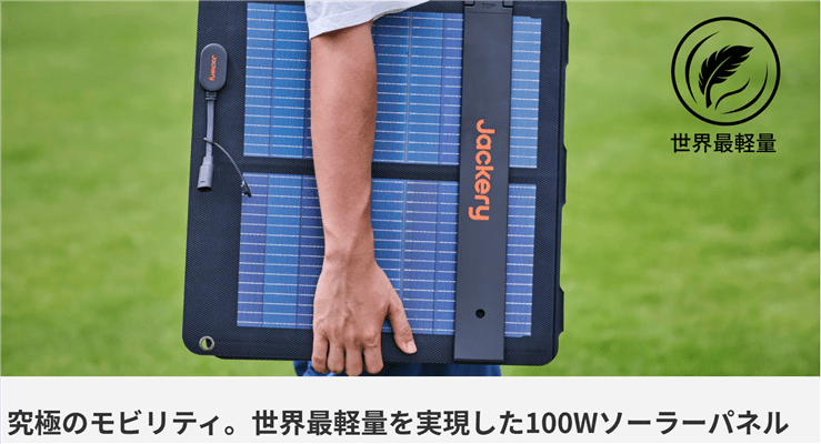 セットのソーラーパネル「Jackery SolarSaga 100W」は、エネルギーの自給自足を現実のものとします。
